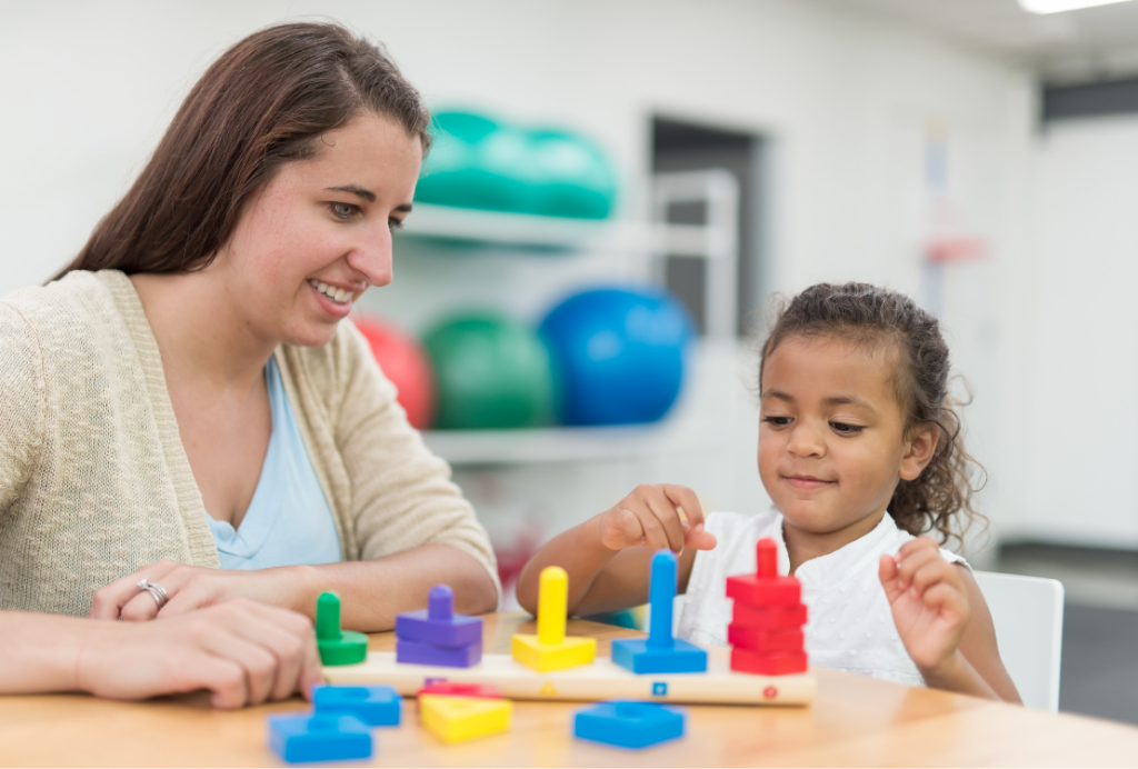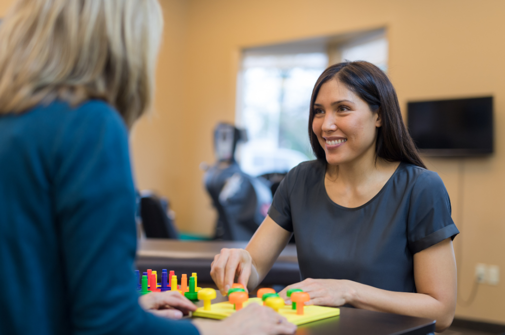 Ergothérapeute et enfant déplaçant des pions sur un tableau dédié à cet effet